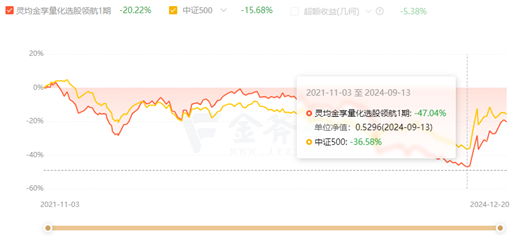 如果从其成立以来的收益率表现看,该基金仅在2022年11月至2024年1月份时的收益率超过中证500指数,其余时间均跑输该指数。2024年9月13日,灵均金享量化选股领航1期出现自成立以来的最大回撤值-47.04%。