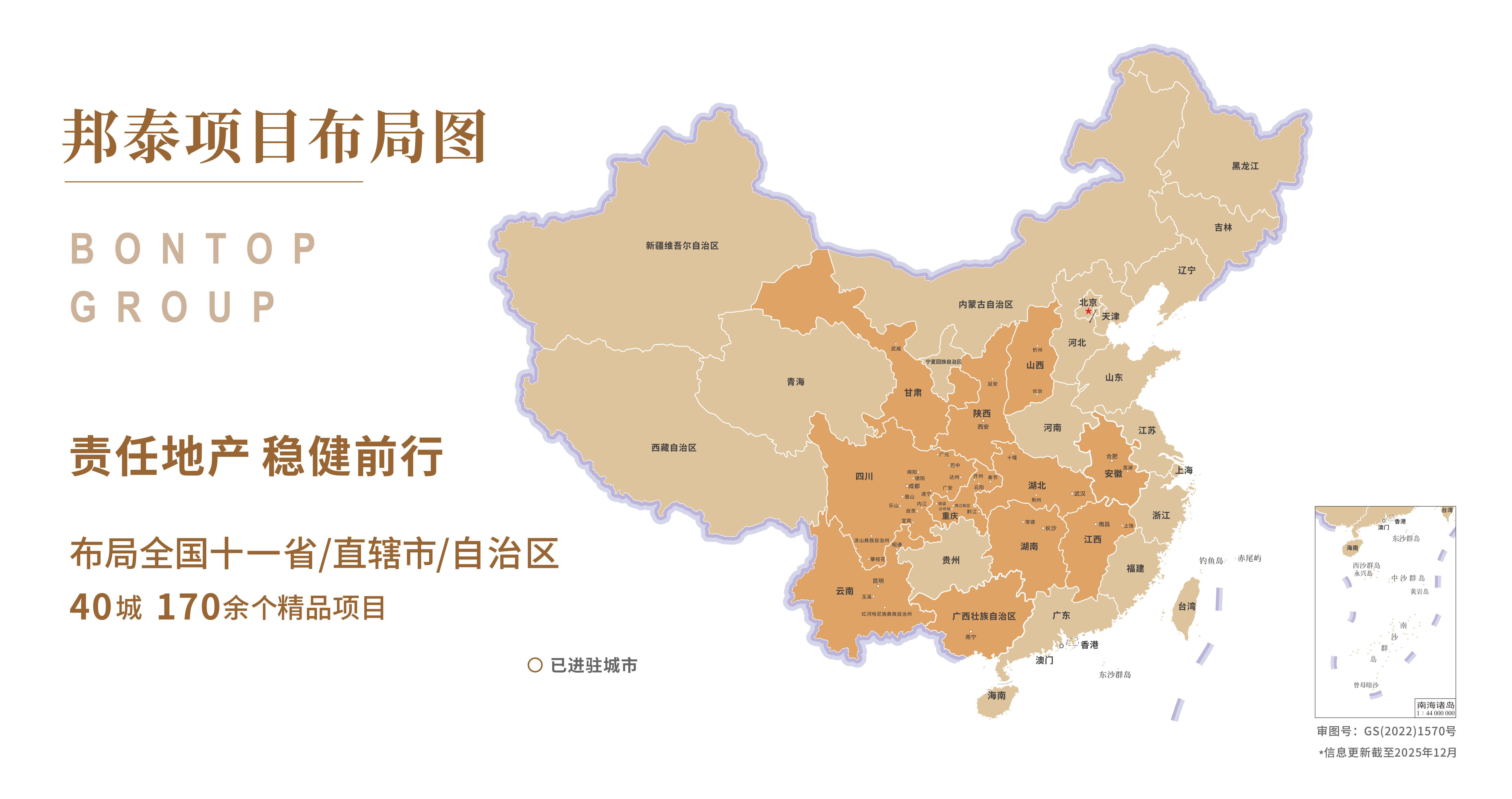 邦泰集团历经18年稳健发展,进驻全国40座城市,累计开发和运营170余个精品项目。以“责任地产”为品牌定位,从区域性深耕走向全国化,已布局成都、武汉、重庆、昆明、合肥、南宁、长沙、西安、南昌等城市及其周边核心城市群。