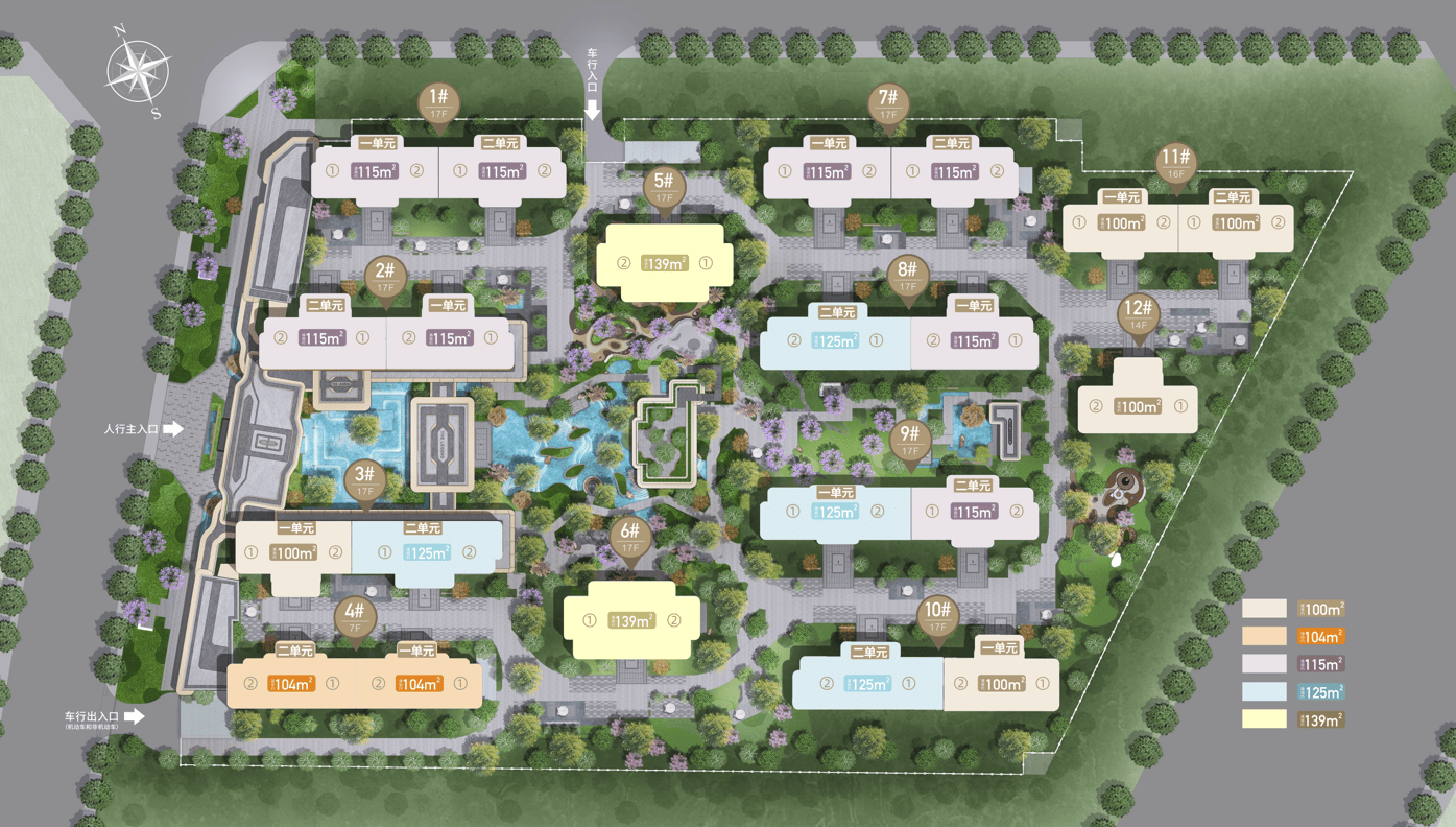 小高层:建面约100㎡套三双卫,建面约115㎡套四双卫,建面约125㎡/139㎡套四三卫