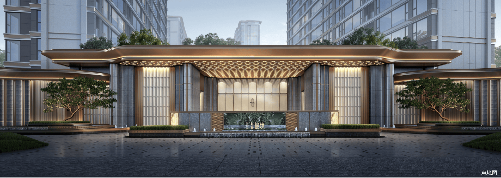 引入漂浮云顶理念,融入明代状元帽形制,匠造约70米宽、8米挑高酒店式入户门阙。
