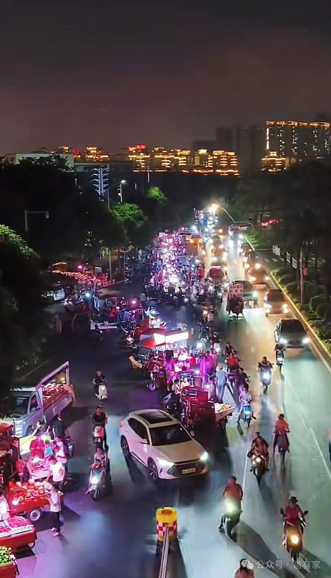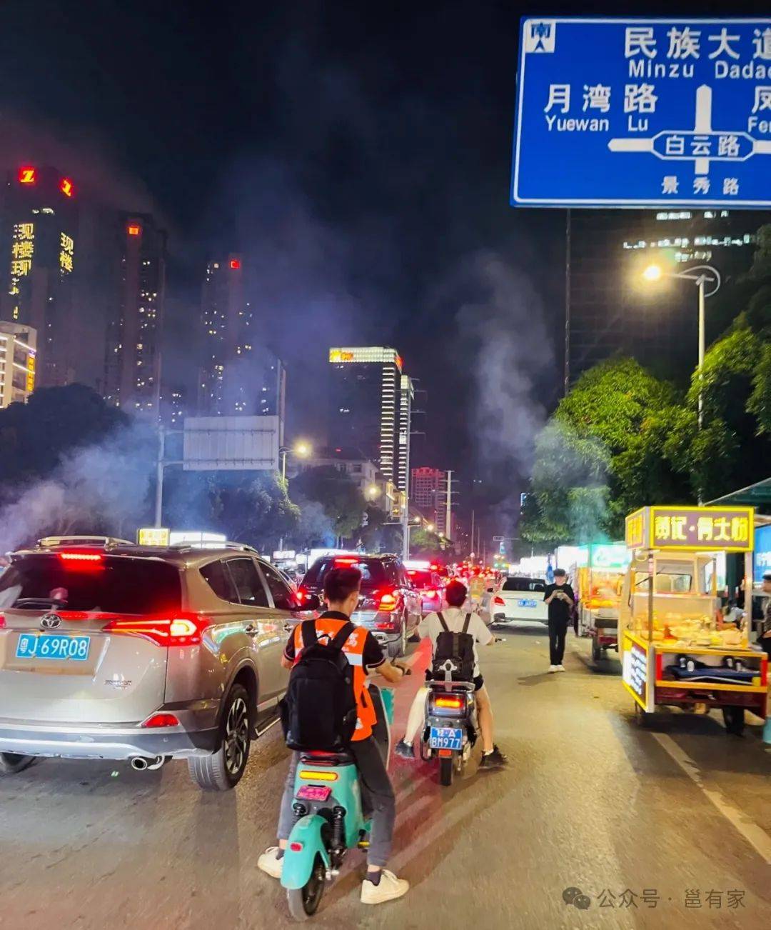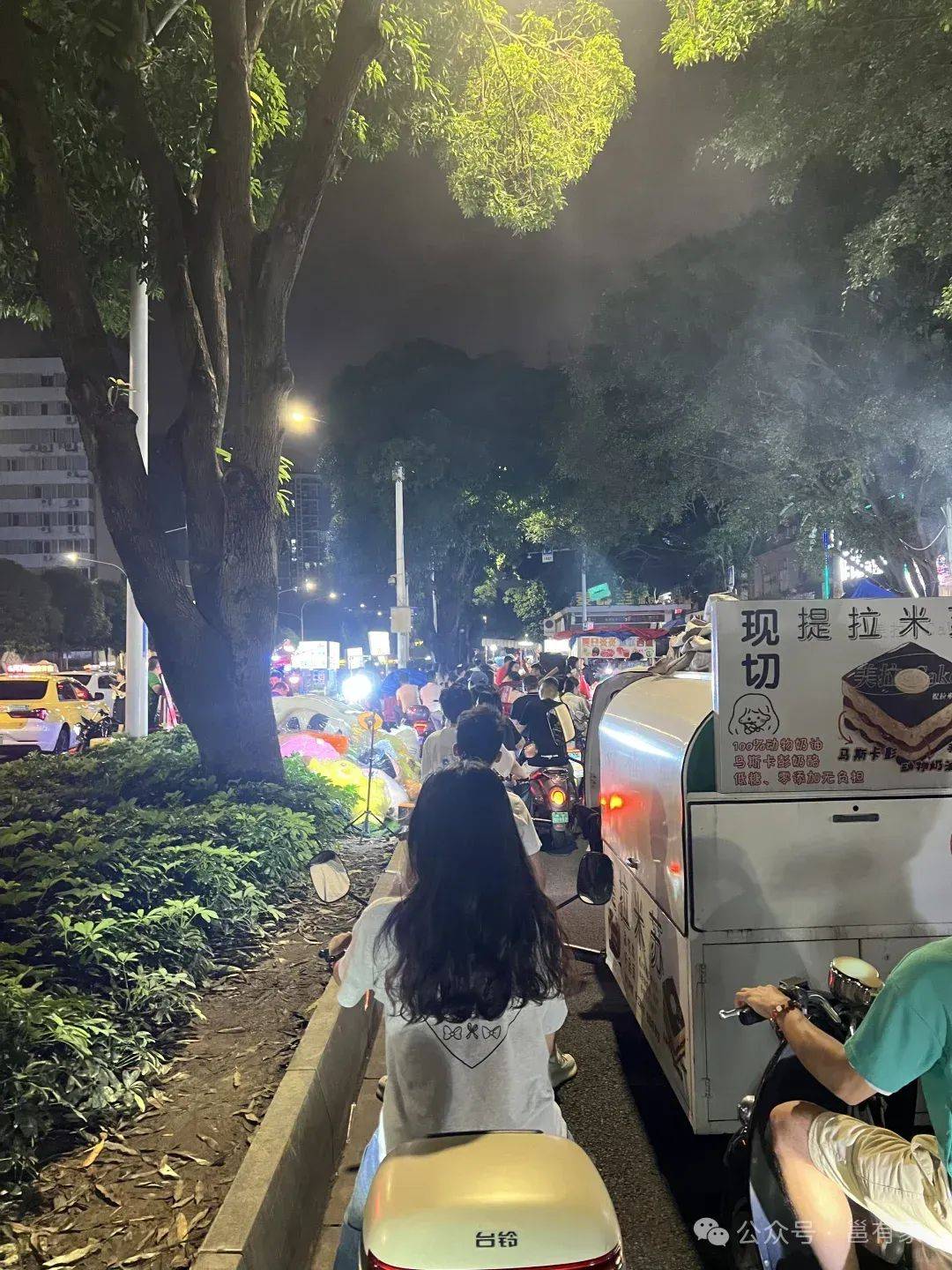 在凤岭北的景秀路,晚上十点没到路边摊就开始支棱起来,各式各样的小推车把电车道全部“占领”完,就差点没摆到旁边的民族大道上去了。