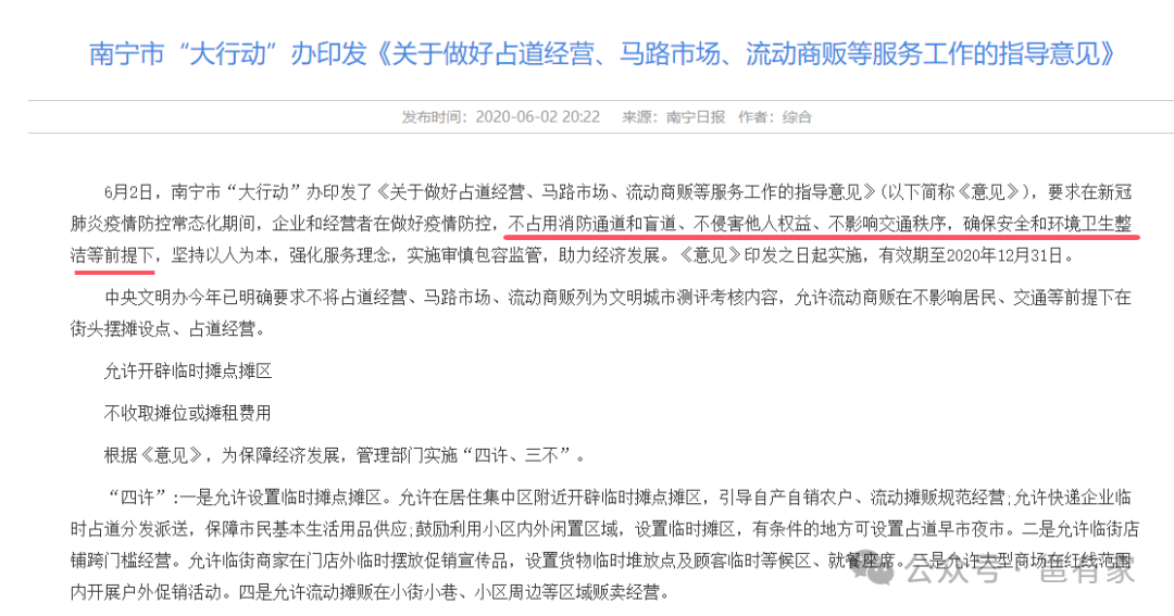 2020年6月,南宁市印发《关于做好占道经营、马路市场、流动商贩等服务工作的指导意见》,允许路边摊在不影响消防、盲道、正常交通秩序的情况下占道经营,给地摊经济打开“绿色通道”。